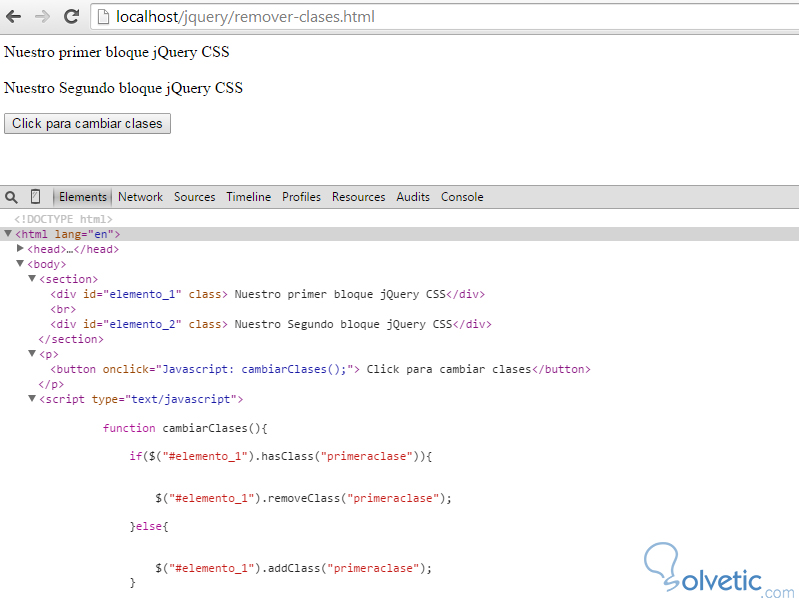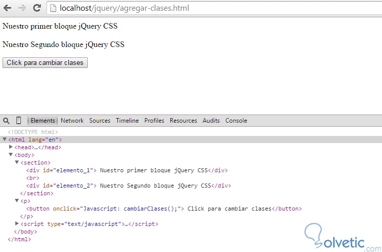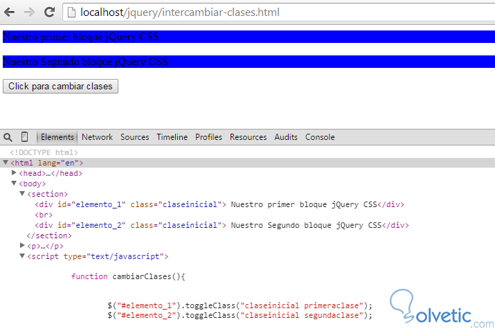 Como vemos es bastante sencillo y al ejecutar esto en nuestro navegador veremos cómo antes de hacer click en el botón los elementos están normales y luego de hacer click cambian de color y se les añaden las clases correspondientes. Veamos en la siguiente imagen a que nos referimos: