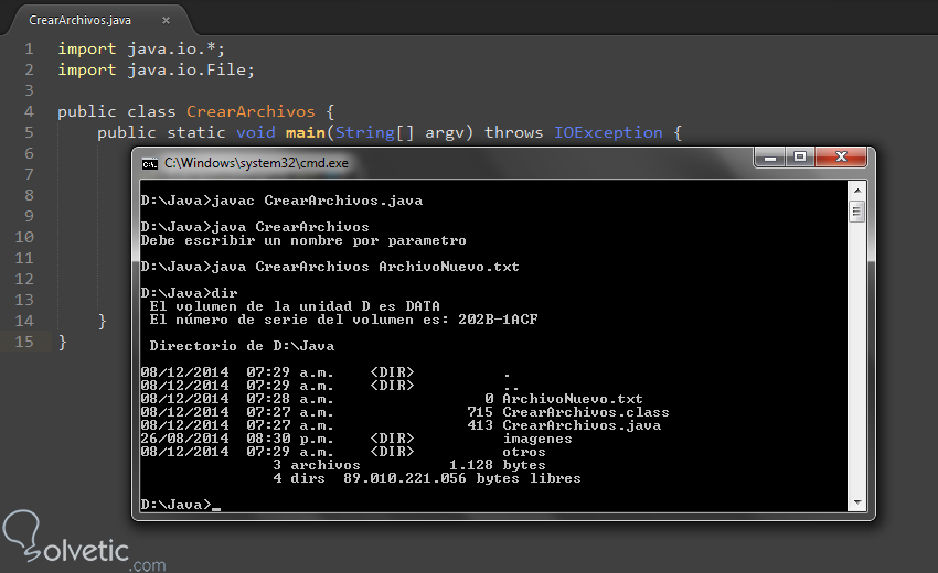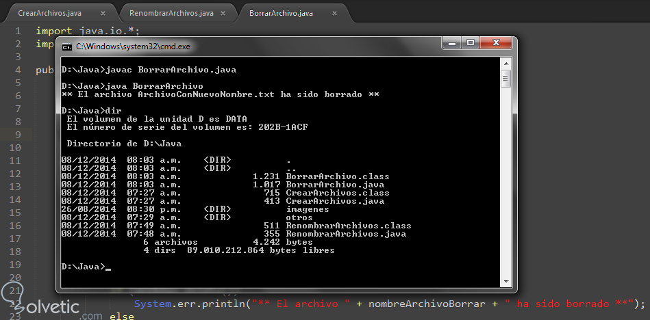 Vemos que lo primero que hacemos es una importación de las clases de java.io para poder tener acceso al manejo de excepciones con IOException, luego importamos la clase java.io.File que es la que nos permite manipular los archivos directamente.