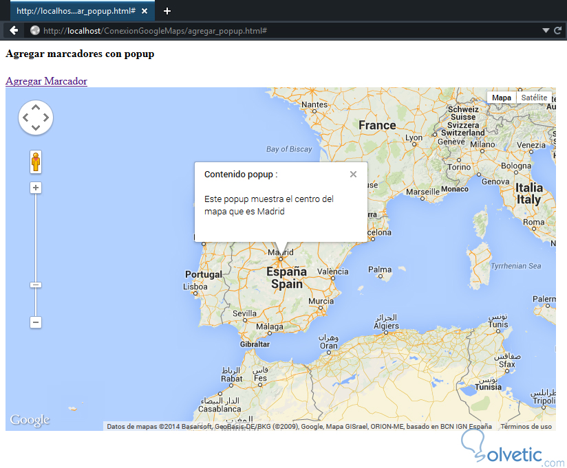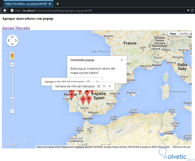 1- Vamos a crear un nuevo archivo agregar_popup.html y utilizaremos como base el ejemplo anterior para insertar las nuevas funcionalidades, para ello copiamos y pegamos el código de nuestro mapa y vamos a localizar la función inicializarMapa() donde luego de obtener el ID vamos a definir con el método InfoWindow el popup para el centro de nuestro mapa, veamos el código para la funcionalidad mencionada: