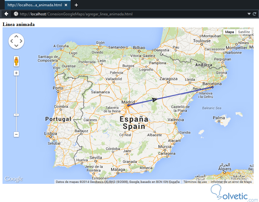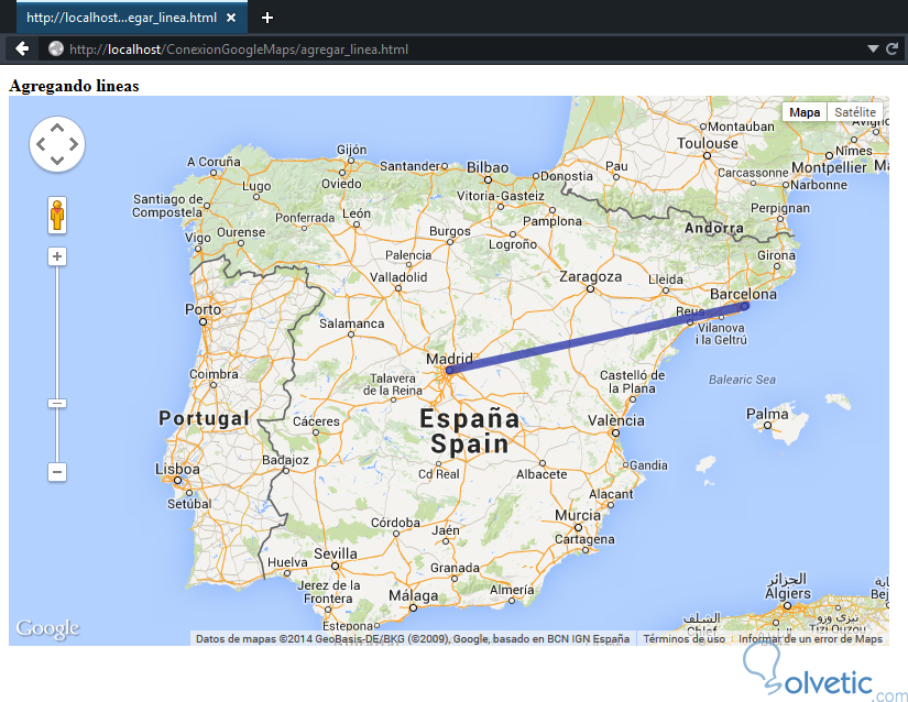 1- Vamos a crear un archivo llamado agregar_linea.html y vamos incluir nuestro API así como los estilos del primer ejemplo, ahora vamos a definir las coordinadas que van desde Madrid a Barcelona, veamos: