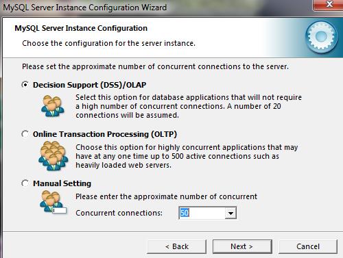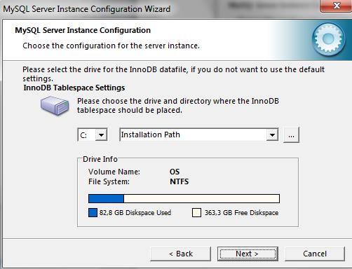 Si no desea usar el path propuesto por defecto en la instalación indique el directorio en el cual estará alojado Innodb Tablespace settting (motor de almacenamiento transaccional para la recuperación en caso de fallas) y configure el número de usuarios concurrentes que proyecta que estarán procesando transacciones en forma simultánea con la opción manual setting.