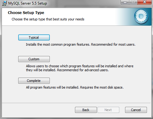 Una vez que se leen y aceptan los acuerdos del licenciamiento de usuario final (GNU General Public License), seleccione la opción de Instalación Típica la cual permite cumplir con los propósitos del presente tutorial y es la recomendada por MySQL para la mayoría de los usuarios, dado que, contiene gran parte de las funcionalidades normalmente requeridas en la gestión de bases de datos.