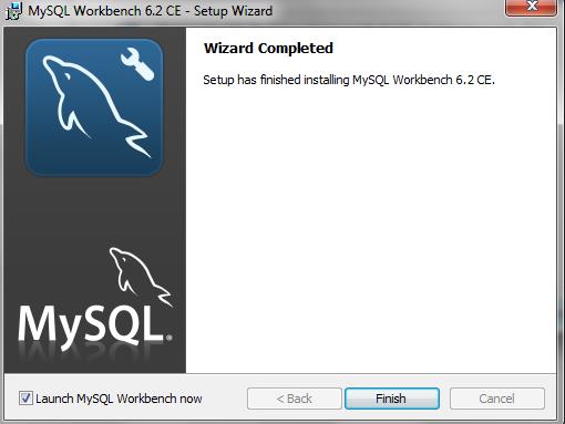 Una vez se realice la instalación de MySQL Workbench 6.2 CE con los parámetros previamente ingresado, presione el botón Next para completar la instalación. El Botón Finish para cerrar el Setup Wizard, y el check en Launch MySQL Workbench now, que permite que la aplicación se inicie de inmediato y se pueda verificar su correcta instalación tal como se muestra a continuación: