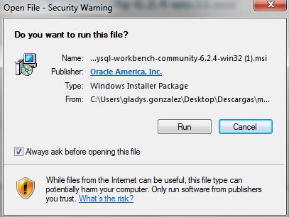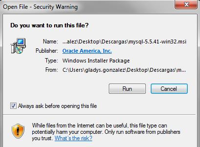 Una vez que el paquete es descargado presione el botón Run para su descompresión e inmediato proceso de instalación y configuración con el Setup Wizard de MySQL tal como se muestra a continuación: