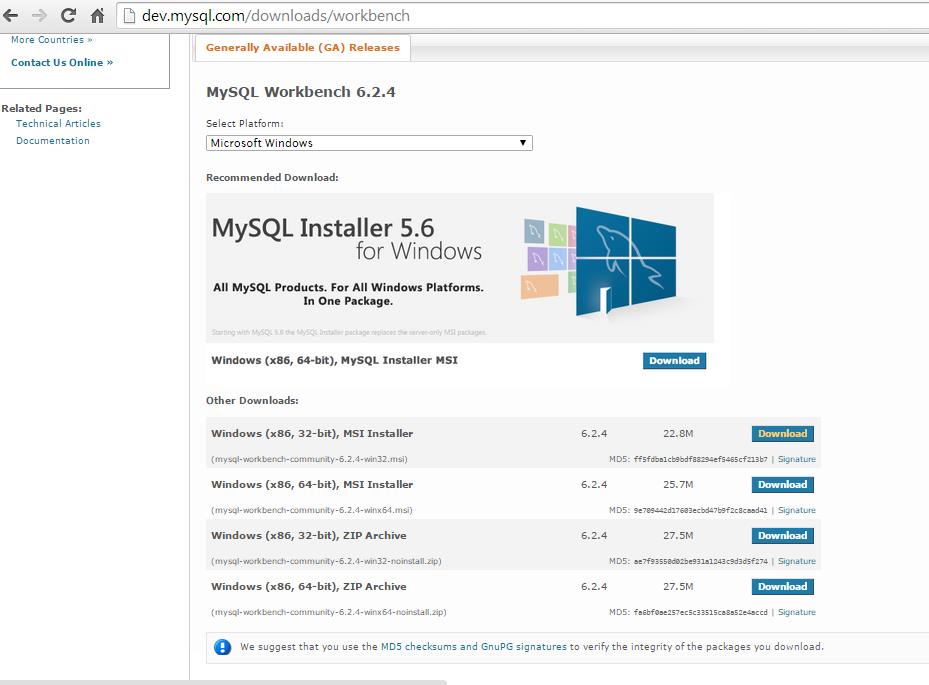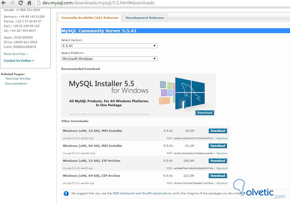 La versión 5.6 de MySQL está disponible para su descarga pero las mejores prácticas recomiendan que mientras se consigue la madurez de una nueva versión lo recomendable es utilizar la anterior, es por ello que se estará trabajando con la versión 5.5.41 de la aplicación. En Internet existen diferentes sitios web para su descarga, sin embargo se aconseja realizarla a través del siguiente enlace: http://dev.mysql.com....html#downloads. A continuación se presentan los pasos e instrucciones más relevantes para la correcta descarga, configuración e instalación del producto.