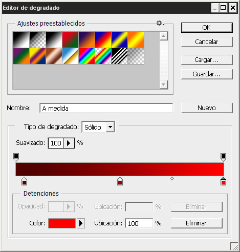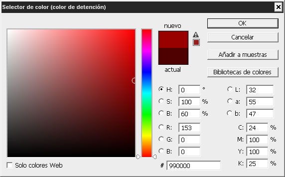 Ahora se hace doble clic sobre el cuadrito del centro, y se le asignan los siguientes valores para el color: 990000