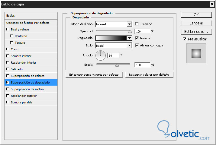 Dentro del cuadro opciones de fusión se hace clic en la opción de superposición de degradado y dentro de ésta se hace clic en la opción de invertir, estilo radial, y se editan los colores de degradación: