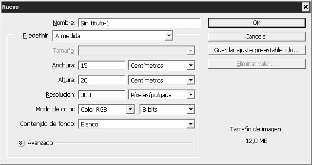 - anchura 15, altura 20, resolución 300, modo de color RGB.