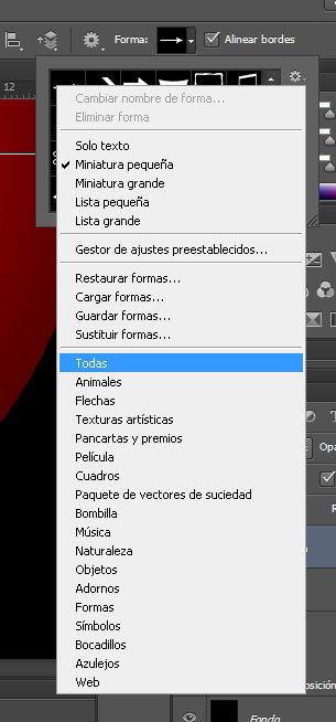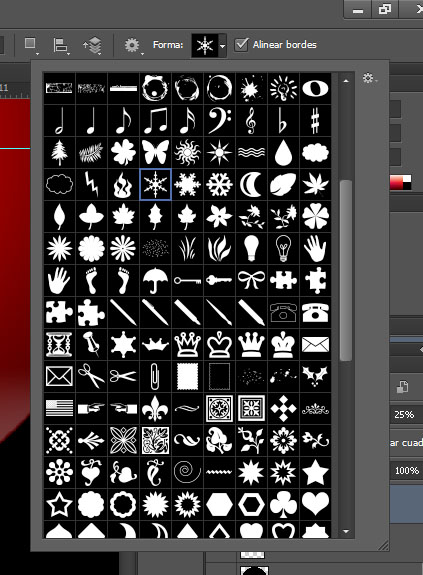 A continuación se selecciona la herramienta de forma personalizada y en la opciones de la herramienta “forma” se marca la opción de “todas” y se busca la que diga “copo de nive”:
