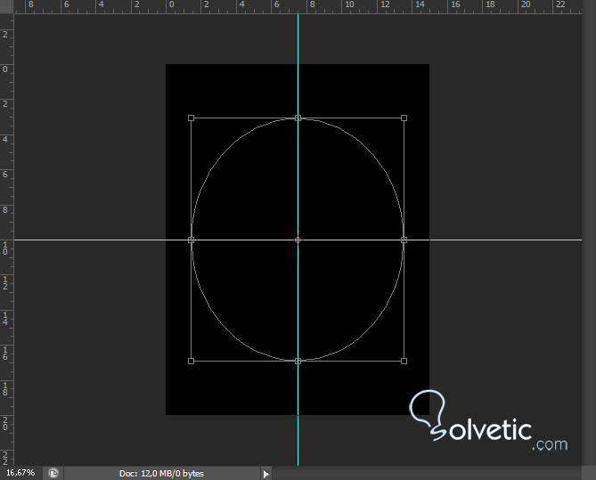 Seguidamente se toma la herramental elipse, se coloca el puntero del ratón en medio de las líneas guías, se desliza el ratón hacia arriba a la derecha y símultáneamente se hace clic en las teclas mayúsculas (Shift) y Alt. De esta manera se creará un círculo perfecto al cual se le otorgará 12 centímetros de ancho.