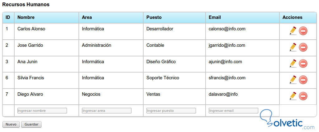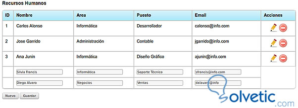 Al insertar una nueva fila veremos las indicaciones en cada caja de texto. Además del script para añadir filas podríamos implementar algún script para validar datos de cada caja de texto con el plugin jquery.validator. En otro tutorial veremos mas adelante como realizar la edición de datos y la eliminación de datos y la fila correspondiente de la tabla leyendo el datos de la celda id para crear dinámicamente las acciones de edición y eliminación en la misma tabla HTML.