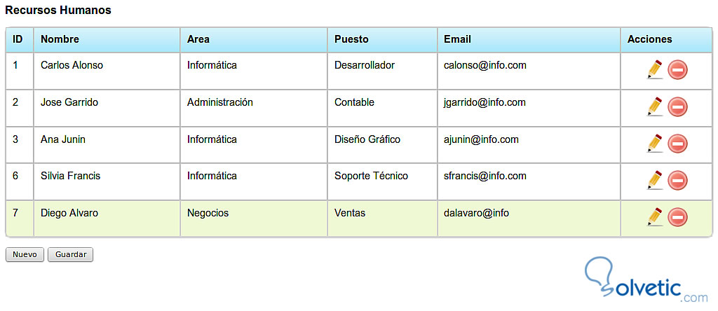 CREATE TABLE IF NOT EXISTS `personal` ( `id` int(11) NOT NULL AUTO_INCREMENT, `nombre` varchar(100) NOT NULL, `area` varchar(100) NOT NULL, `puesto` varchar(100) NOT NULL, `email` varchar(100) NOT NULL, PRIMARY KEY (`id`) ) ENGINE=InnoDB DEFAULT CHARSET=latin1 AUTO_INCREMENT=1; -- -- Insertamos algunos datos -- INSERT INTO `personal` (`id`, `nombre`, `area`, `puesto`, `email`) VALUES (1, 'Carlos Alonso', 'Informática', 'Desarrollador', 'calonso@info.com'), (2, 'Jose Garrido', 'Administración', 'Contable', 'jgarrido@info.com'), (3, 'Ana Junin', 'Informática', 'Diseño Gráfico', 'ajunin@info.com');