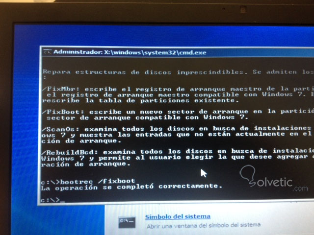 Cómo véis en la imágen debemos escribir y ejecutar el comando bootrec.exe dentro de C: (Tu unidad de disco del sistema)