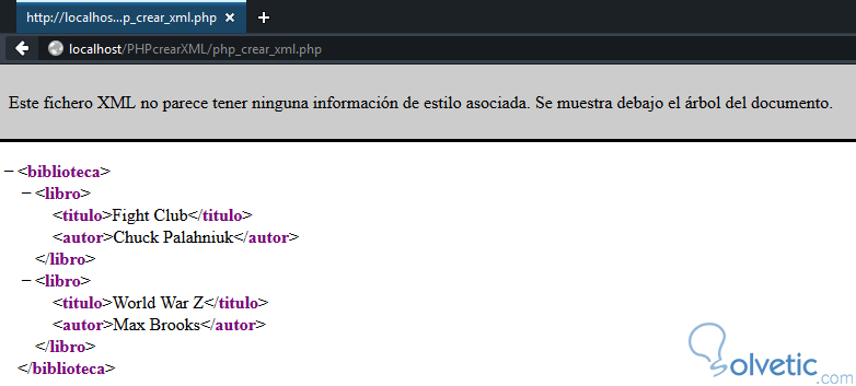 </biblioteca>Vemos acá como lo primero que hacemos es generar la cabecera del documento con el header, esto hará que podamos colocar la etiqueta de inicio de nuestro XML sin levantar errores de sintaxis en PHP, luego colocamos fuera del código nuestra etiqueta raíz del schema, en este caso biblioteca.