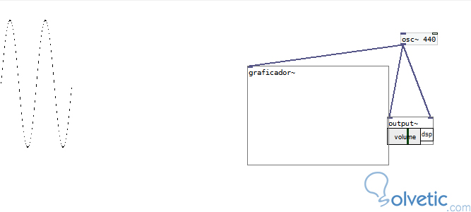 Vamos a tomar de ejemplo el primer archivo que generamos en este tutorial, vamos a incluir el subPatch graficador a nuestro oscilador de 440 Hz, con ello podremos ir cambiando la frecuencia y ver cómo va cambiando el gráfico.