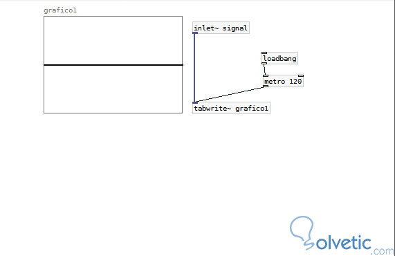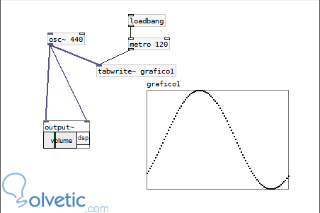 Para ver el gráfico del sonido que estamos produciendo necesitamos enviar el impulso del objeto correspondiente a tabwrite~ para ello debemos seguir los siguientes pasos: