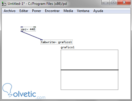 2- Vamos a proceder ahora a seleccionar de nuestro ejemplo anterior todos los elementos excepto el oscilador y su output~, y los vamos a cortar, luego vamos a pegar esto en el documento graficador~.pd que habíamos creado con anterioridad.