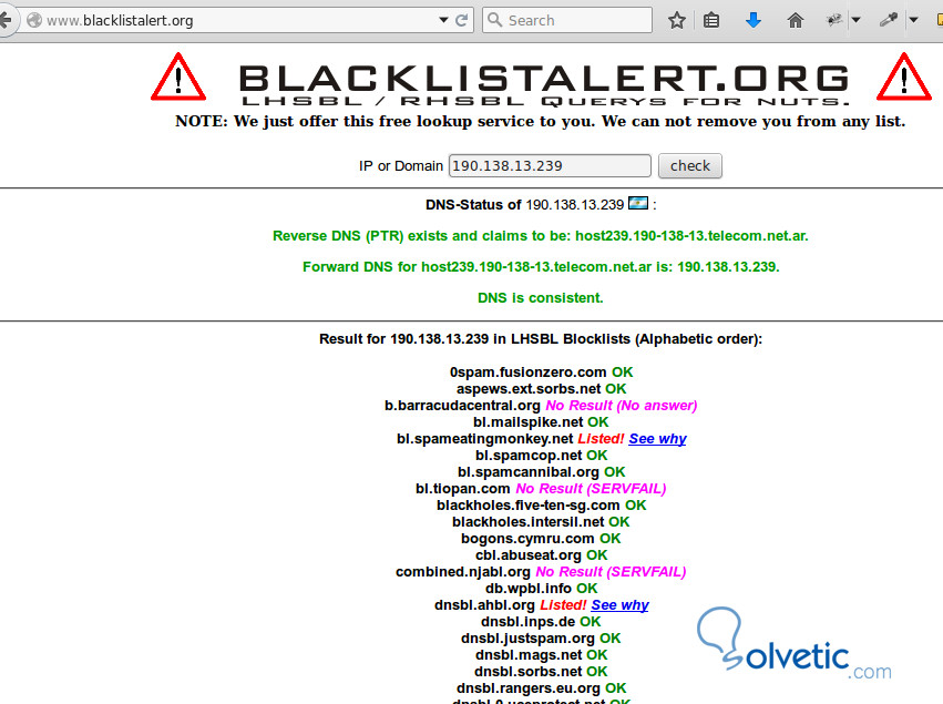 BlackListAlert.org es una herramienta online muy utilizada que ofrece gratuitamente buscar si nuestra dirección IP o nuestra página web está en la alguna lista negra. Si al realizar la búsqueda por dominio o por IP el sitio web aparece en algunas la lista negra no se pueden eliminar de la lista desde BlackListAlert, pero proporcionará un link See Why (Mira Porque) para ver las razones por las que estamos en dicha lista negra.