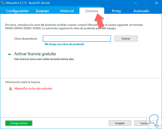 En la pestaña Licencia podemos tener licencia grats durante 30 días (Enviando nuestro mail). También podemos comprar la licencia si lo queremos más tiempo. Es importante decir que esos 30 días nos dejan usarlo de forma completa, es decir, que nos analiza, detecta malware y podemos eliminarlo. Punto bueno para ver lo bien que actua este programa.