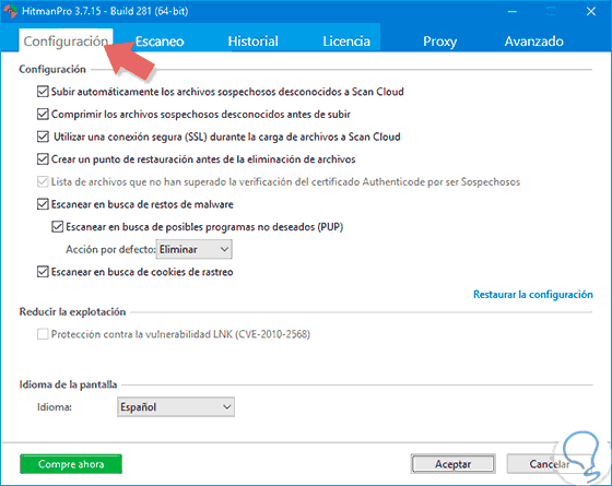 En la pestaña Escaneo podremos si nos interesa programar escaneos y por si queremos que aparezca Integración de Shell (integrado Hitman PRO con el explorador del sistema).