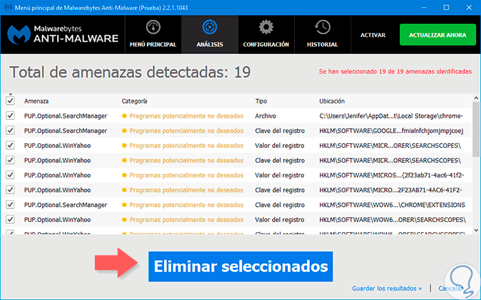 Una vez que hemos realizado completamente el escaneo aparecerán todas las posibles amenazas de malware detectadas. Ahora tan sólo tendremos que dar a eliminar para deshacernos de esos archivos peligrosos.