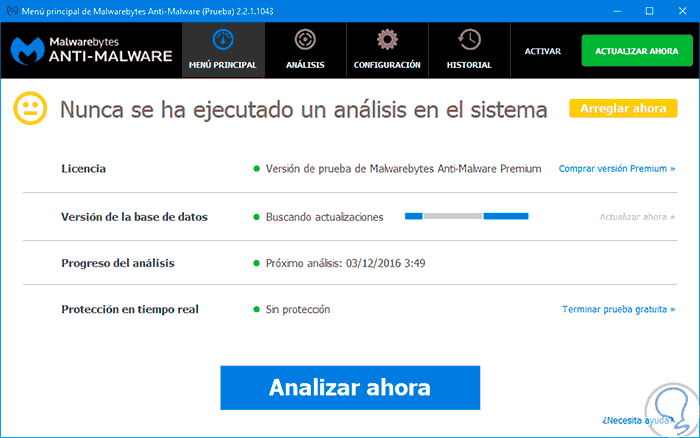 Al ejecutarse por primera vez Malwarebytes, veréis que automáticamente actualiza el programa para tenerlo a la última con la Base de Datos bien actualizada para estar bien protegido.