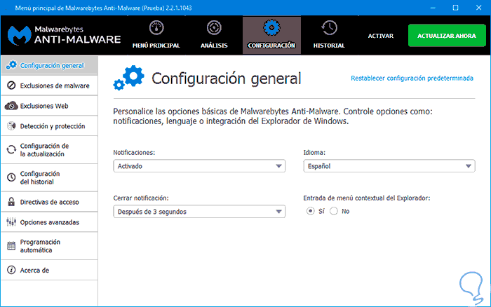 Para configurarlo seleccionamos Configuración, como podéis ver aquí veremos varias opciones de modificación en la forma del análisis entre otras. Sólo tienes que darle a guardar para que se efectúen los cambios.