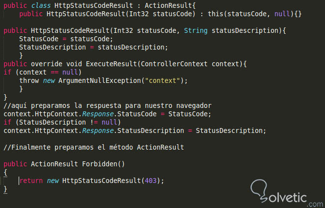 En el siguiente ejemplo veremos cómo podemos generar un código personalizado de estado, de esta forma el navegador al recibirlo puede tomar una acción. Para ello primero vamos a definir la clase que establezca una respuesta acción, con un código y su respectiva descripción. Luego en un método podemos llamar el Action Result y pasarle el código que deseamos que reciba el navegador, así ya tendremos el ciclo completo. Veamos la imagen del código correspondiente: