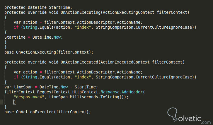 public interface IActionFilter{void OnActionExecuting(ActionExecutingContext filterContext);void OnActionExecuted(ActionExecutedContext filterContext);}Donde OnActionExecuting es para ejecutar la acción antes del controlador deseado, y OnActionExecuted es la acción posterior. Veamos la imagen del código completo:Todo esto al ejecutarlo en nuestra aplicación nos permite generar un response en el header con el resultado del tiempo que construimos y nos fijamos que para lograr esto utilizamos el método AddHeader de Response.