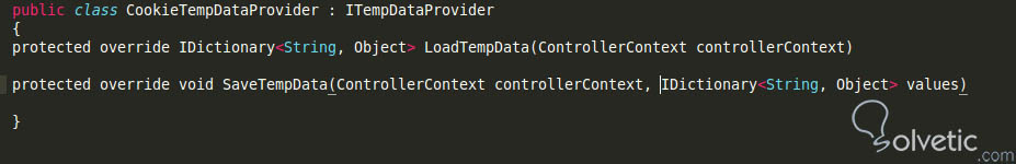 Vemos como la clase CookieTempDataProvider viene del componente que admite personalizaciones ItempDataProvider, con ello asumimos todas sus funcionalidades, donde simplemente lo que hacemos es cambiar y sobrescribir los métodos que queremos que funcionen de manera diferente.
