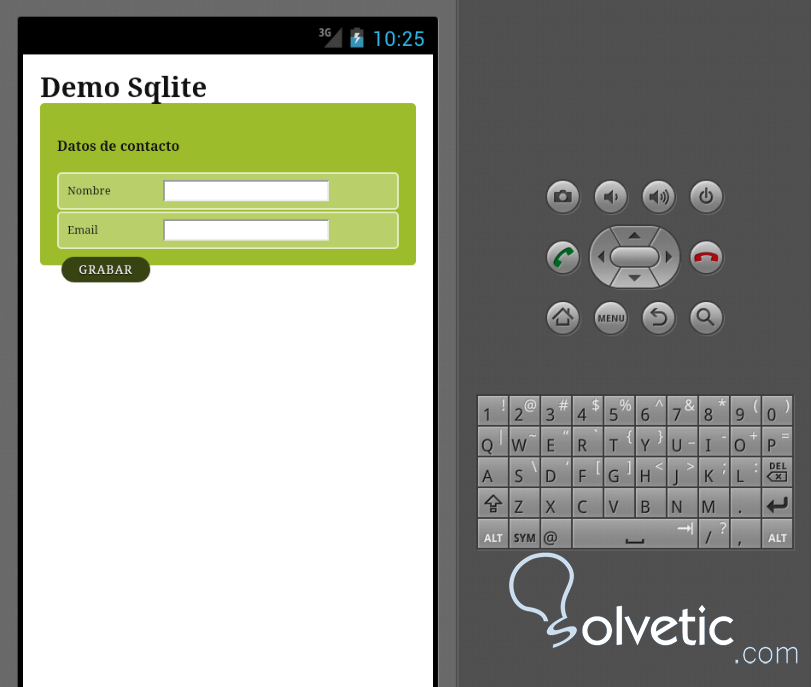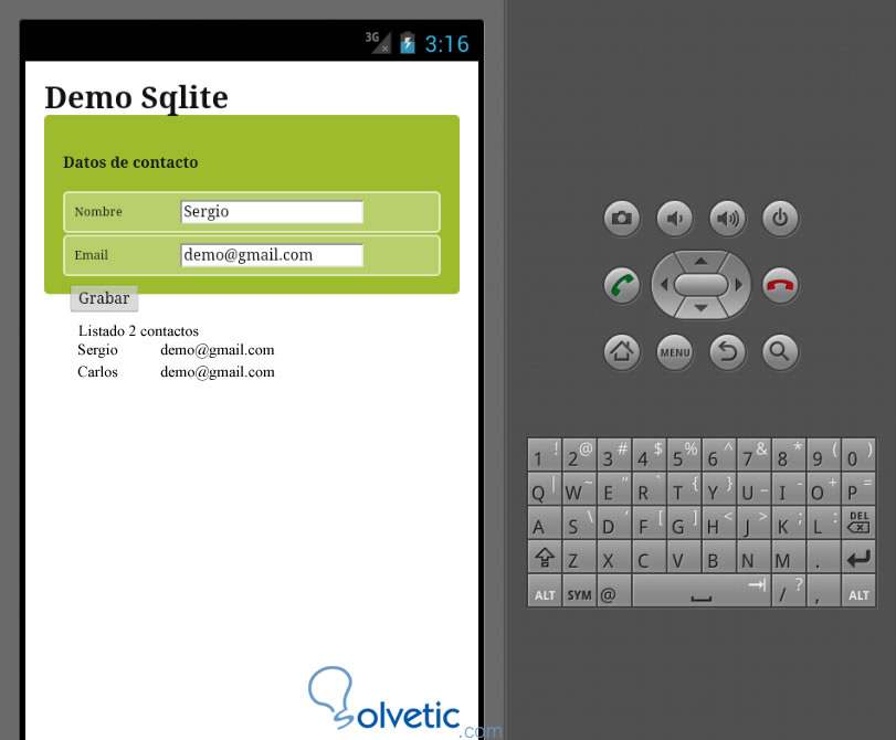 }Cuando tenemos todo el código volvemos a compilar la aplicación desde la terminal con el siguiente codigocordova emulate androidCuando se despliegue el emulador con la aplicación comenzaremos a añadir registros a nuestra Agenda y estos aparecerán listados debajo, el dispositivo mantiene los datos que vayamos introduciendo de forma persistente en una memoria virtual es decir que la base de datos no se borrara cada vez que ejecutemos la aplicación en el emulador o en un dispositivo real podremos ver los datos que fuimos dando de alta.