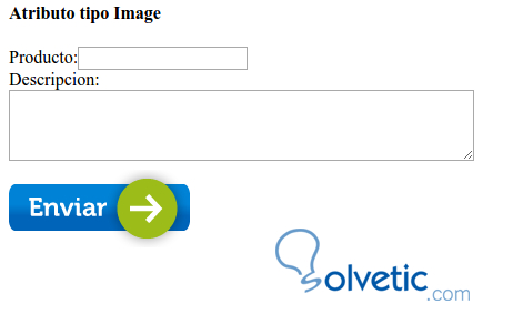 <html> <body> <h4>Atributo Form</h4> <form> <form action="grabar.php" id="formA"> Producto:<input type="text" name="producto"> <br> Descripcion: <br><textarea rows="4" cols="50"></textarea> <br> <input type="submit" value="Enviar"> </form> <br> <p>Lorem Ipsum es simplemente el texto de relleno de las imprentas y archivos de texto. </p> <p>Lorem Ipsum es simplemente el texto de relleno de las imprentas y archivos de texto. </p> <p>Lorem Ipsum es simplemente el texto de relleno de las imprentas y archivos de texto. </p> <br> Stock: <input type="text" name="stock" form="formA"> <input type="submit" formaction="stock.php" form="formA"> </body> </html> Atributo Image con submit Si queremos utilizar una imagen como botón tipo submit para enviar un formulario, la única forma de hacerlo era poner una imagen o bien utilizar hojas de estilo css y luego hacer la funcionalidad con javascript. <html> <body> <h4>Atributo tipo Image</h4> <form> <form action="grabar.php" id="formA"> Producto:<input type="text" name="producto"> <br> Descripción: <br><textarea rows="4" cols="50"></textarea> <br> <input type="image" src="enviar.png" alt="Submit" width="163" height="78"> </form> </body> </html>