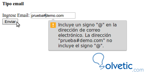 <html> <body> <h4>Tipo email</h4> <form> Ingrese Email: <input type="email" name="email" value=""> <br> <input type="submit" value="Enviar"> </form> </body> </html>