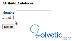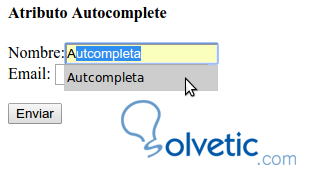 <html> <body> <h4>Atributo Autocomplete</h4> <form> <form autocomplete="on"> Nombre:<input type="text" name="nombre"> <br> Email: <input type="email" name="email" autocomplete="off"><br> <br> <input type="submit" value="Enviar"> </form> </body> </html>Vemos que al ingresar la palabra Autocompleta y enviar al acceder al mismo formulario luego y presionar solo la letra A, ya sugiere en este caso la palabra que habíamos escrito anteriormente.