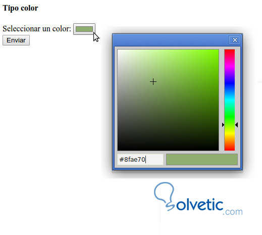El atributo tipo color se utiliza para campos donde es necesario contener un color. Según el navegador y el soporte que ofrezcan aparecerá el control tipo colorpicker para poder seleccionar un color o bien escribir el color en hexadecimal. El selector aparecerá en forma de pop-up cuando se hace click en el color.