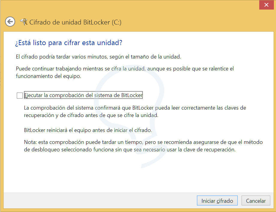 Ahora lo que nos pregunta es si estamos listos para cifrar la unidad, podemos decir que nos ejecute también una comprobación del sistema Bitlockes para estar seguros que funcionan las claves de recuperación. Pulsamos en Iniciar cifrado y empezará a realizarlo.