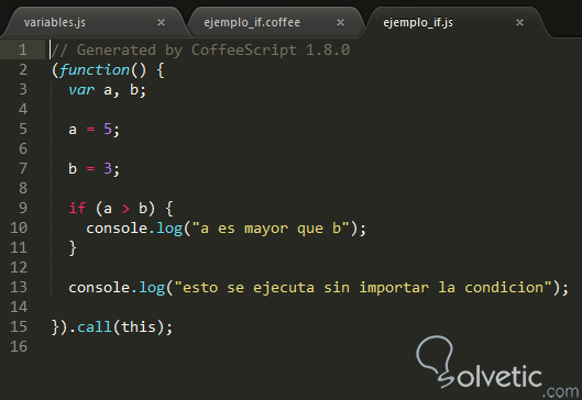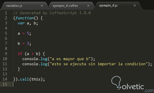a = 5b = 3if a > b console.log "a es mayor que b"else console.log "a no es mayor que b"console.log "Esta linea se ejecuta siempre"Procedemos a compilar nuestro programa y veremos el archivo .js resultante en la siguiente imagen:
