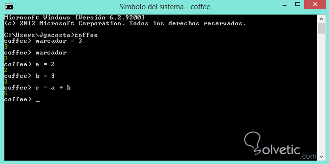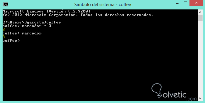 marcador = 3Vamos a ejecutar este ejemplo sencillo en nuestra consola de CoffeeScript, para ello accedemos a nuestra consola de comandos y escribimos coffee, veamos la respuesta de la consola al ejecutar nuestro ejemplo: