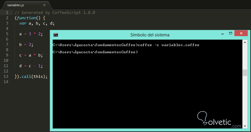 a = 3 * 2b = 2c = a * bd = c - 1Ahora veamos que resulta de compilar nuestro archivo al escribir en la consola: coffee -c variables.coffee.