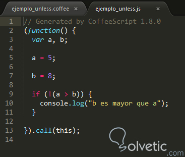 a = 5b = 8unless a > b console.log "b es mayor que a"Donde si compilamos este pequeño programa nos da como resultado el siguiente código JavaScript: