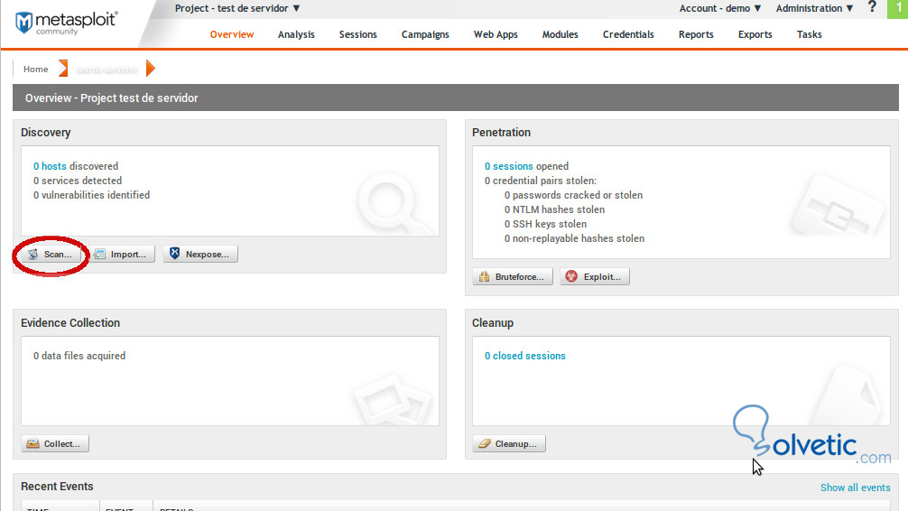Una vez creado entraremos en el panel de control del proyecto haciendo clic sobre su nombre en el listado de proyectos, esto nos enviará a la siguiente pantalla donde podremos ver diferentes herramientas. Cómo vemos en la imágen desde el panel de control del proyecto podemos hacer por ejemplo un escaneo de puertos y host con la herramienta scan. Si encuentra host o servicios disponibles nos lo mostrará luego en el listado.