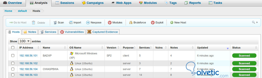 worker is stopped metasploit is stopped prosvc is stopped nginx is stopped /opt/metasploit/postgresql/scripts/ctl.sh : postgresql stopped /opt/metasploit/postgresql/scripts/ctl.sh : postgresql started at port 7337 prosvc is running >> Deleting stale PID file log/thin.pid Worker starting in backgroundTrabajaremos ahora desde el panel de interface web, donde crearemos nuestros host analizar por dirección ip y también veremos que análisis podemos aplicar.