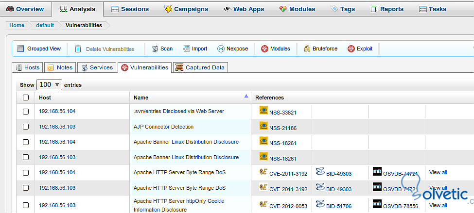 Algunas vulnerabilidades obtenidas por ejemplo es CVE-2011-3192, para saber que significa debemos ir a la página web de la National Vulnerability Database (Base de datos Nacional de Vulnerabilidades) en el siguiente enlace.