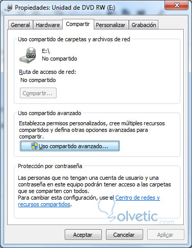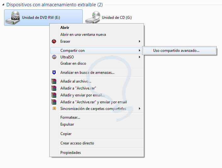 2. Nos ponemos encima de la unidad de DVD (O la que queramos compartir) y pulsamos botón derecho.