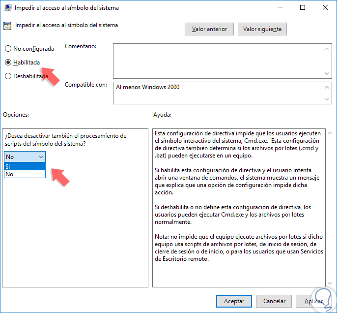 Si también queremos deshabilitar la ejecución de los Scripts no olvidéis pulsar en la parte de abajo la pestaña “¿Desea deshabilitar también el procesamiento de scripts en el símbolo de sistema?”. Pulsamos en Sí y aceptamos.