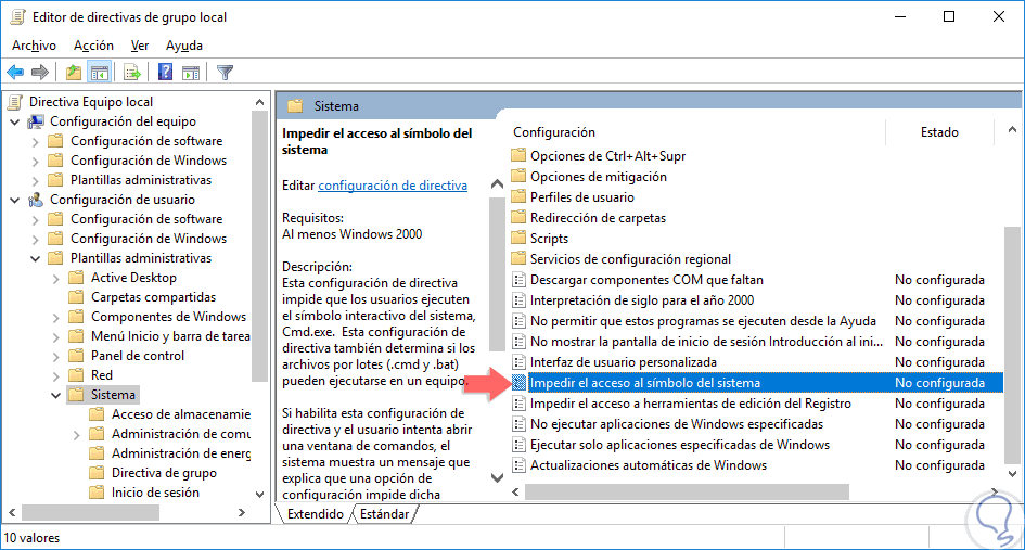 Hacemos doble click (en la derecha del panel) en la opción “Impedir el acceso al símbolo de sistema”.