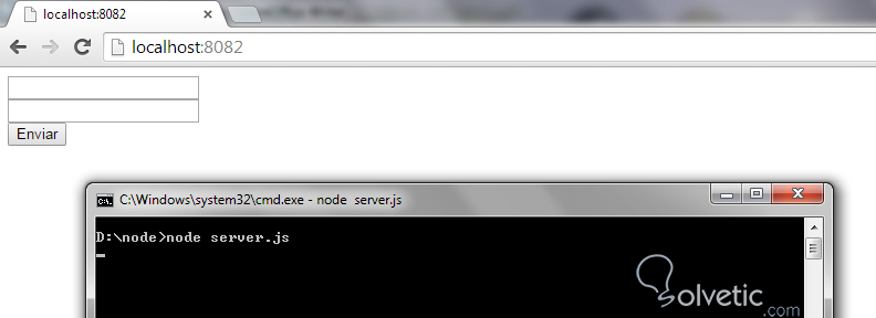 var http = require('http');var querystring = require('querystring');var util = require('util');var form = require('fs').readFileSync('formulario.html');http.createServer(function (request, response) { if (request.method === "POST") { var datosPost = ''; request.on('data', function (chunk) { datosPost += chunk; }).on('end', function () { var datosPostObjeto = querystring.parse(datosPost); console.log('El usuario Envió los datos:\n', datosPost); response.end('Has enviado los datos:\n' + util.inspect(datosPostObjeto)); }); } if (request.method === "GET") { response.writeHead(200, {'Content-Type': 'text/html'}); response.end(form); }}).listen(8082);Para que todo resulte lo más legible posible se incorporó adicionalmente los módulos querystring y util, con ellos podemos procesar la información que viene del servidor y así poder manipularla para hacer la impresión de la misma.Veamos cómo debe lucir inicialmente nuestro formulario cuando iniciamos nuestra aplicación y abrimos el navegador en la ruta raíz del proyecto: