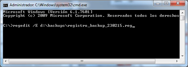 regedit /E (Ruta donde quieres guardar el archivo de backup, le pones nombre NOMBRE.reg)Ya sólo se espera a que se termine la copia de seguridad del Registro y listo.