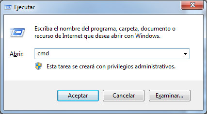 2. Al pulsar en Aceptar (o Intro) aparecerá la consola de comandos (Símbolo de Sistema) y escribimos el siguiente comando: