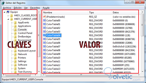 Esas son las partes principales, pero se debe saber que una cosa son las claves y subclaves y otra los valores de las mismas. En el editor del registro podremos ver cómo en la parte de la izquierda es donde se encuentran estas claves con subclaves y en la parte derecha podemos ver el valor de esas claves.